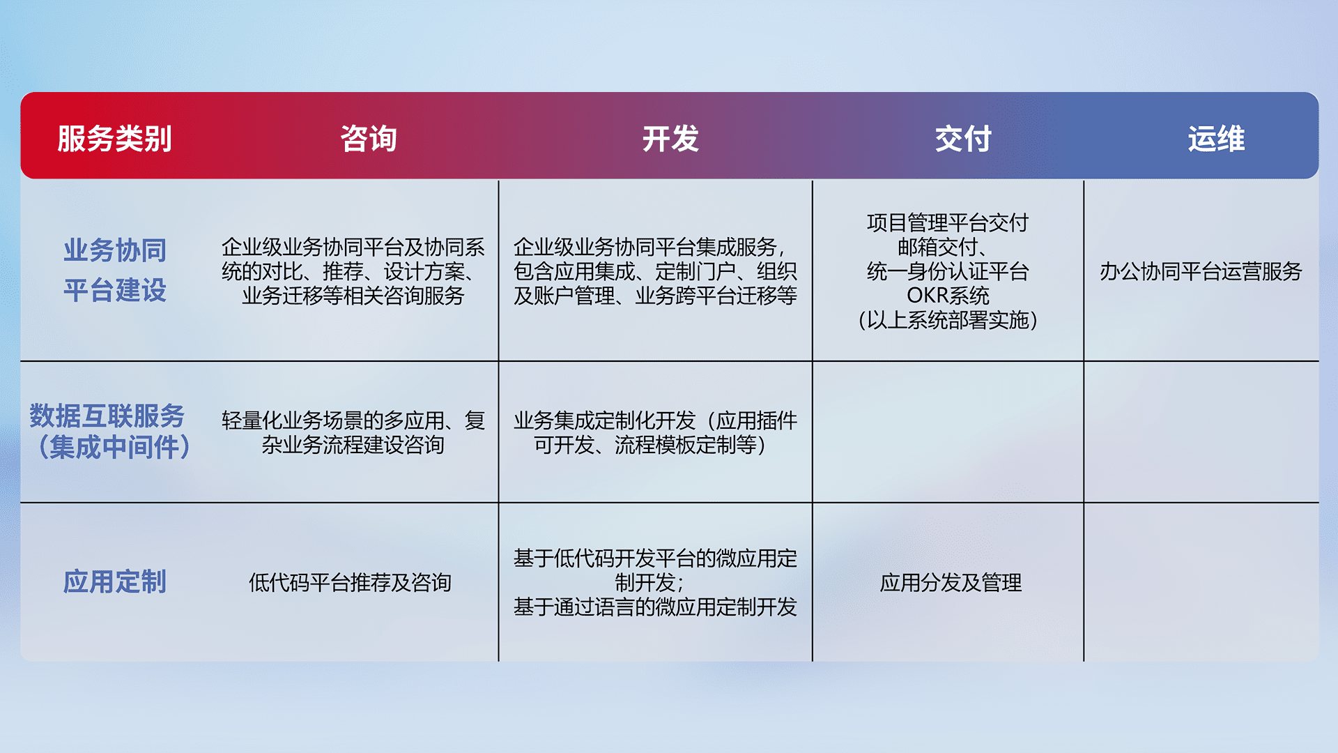 针对钉钉、、、、企微、、、、IDaas等平台级产品提供产品的规划、、、、方案、、、、交付、、定制化开发等服务,,实现如统一协同办公、、、智能客户服务、、、混合会议管理、、智能数据查询、、、、等业务场景,,,,实现数字化转型。。